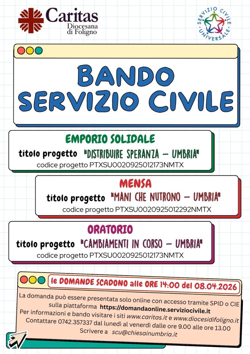 Il Dipartimento per le Politiche Giovanili ed il Servizio Civile Universale ha pubblicato il nuovo Bando per la selezione di giovani tra i 18 e i 28 anni da impiegare per un anno in progetti di Servizio Civile Universale. Anche quest’anno c’è la possibilità di selezionare per la Diocesi di Foligno 14 operatori volontari da impiegare in progetti di servizio civile promossi dalla Caritas.