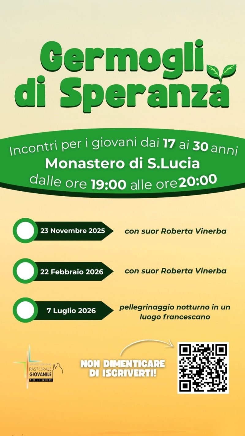 Domenica 23 novembre dalle ore 19.00 alle 20.00 riprendono gli incontri per giovani dai 17 ai 30 anni presso il Monastero di Santa Lucia in Foligno promossi dalla Consulta per la pastorale giovanile della Diocesi di Foligno. Il primo incontro sarà guidato da Suor Roberta Vinerba consacrata francescana legata all’Arcidiocesi di Perugia – Città della Pieve. La consacrata vive nella parrocchia di Santa Maria in … Continua a leggere Riprendono i germogli di speranza »